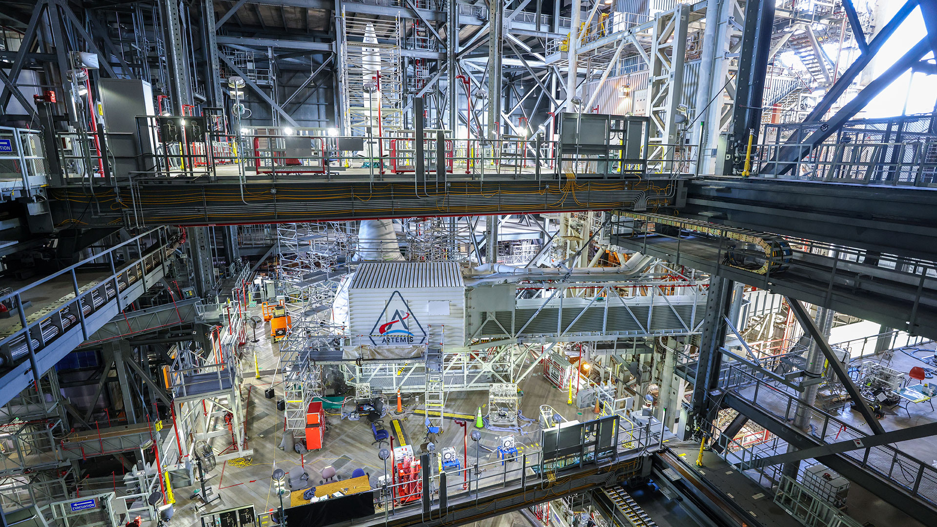 The environmental enclosure that is typically painted all white — hence, in part, its name — has been adorned with the red, blue and silver Artemis program logo on one side of its exterior. The white room, which is mounted at the end of the 60-foot-long (18-meter) crew access arm atop the mobile launcher, is the astronauts' last stop before climbing into their spacecraft to launch.