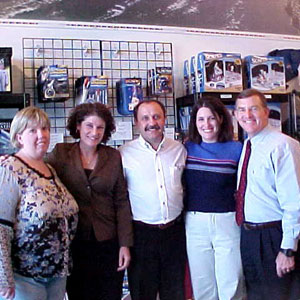 LEFT: Susan Helms, Yuri Usachev and James Voss with The Space Store staff, September 23, 2002, Houston, TX (Credit: Dayna Justiz);